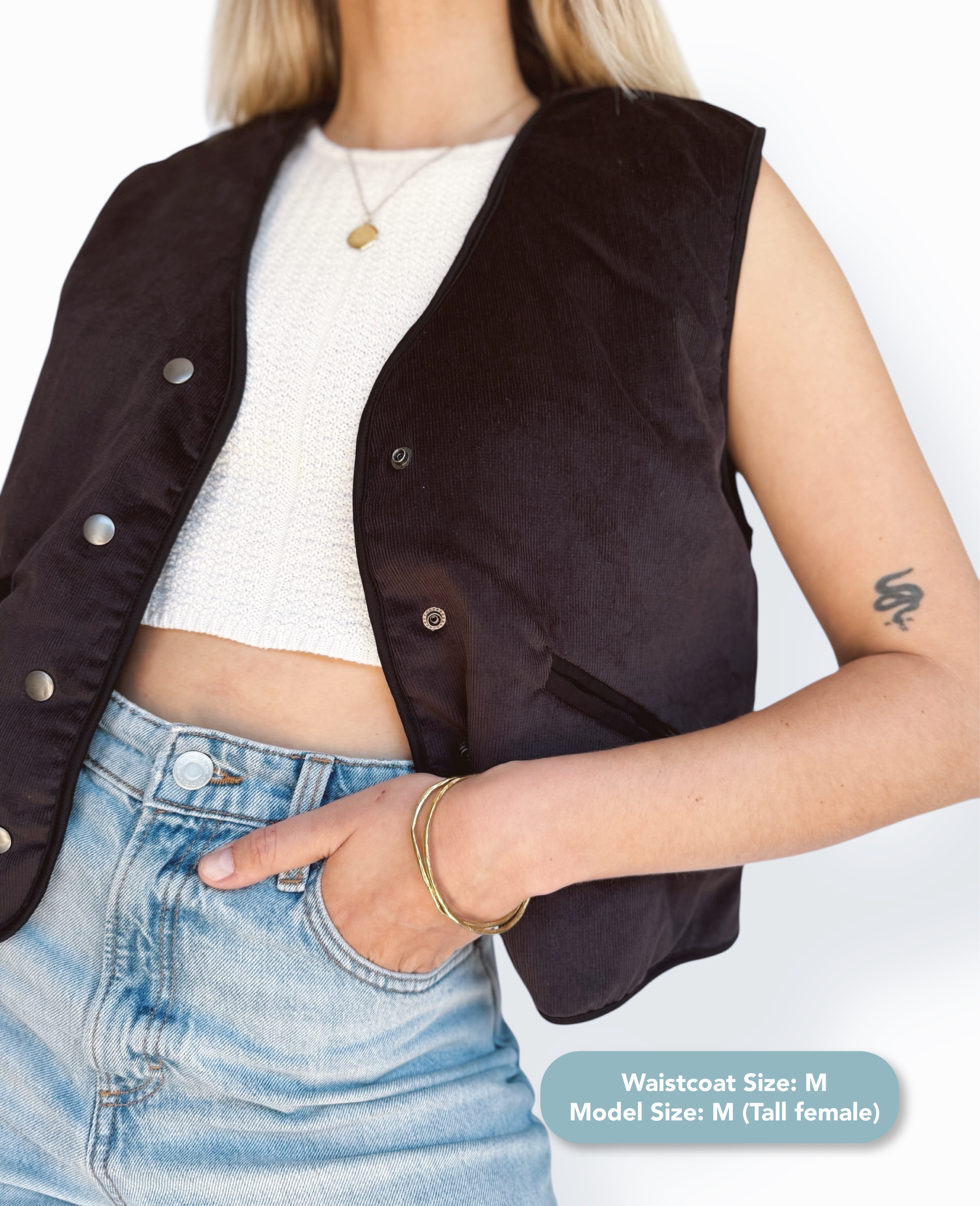 When choosing your size, refer to the size guide (last image) or feel free to reach out to us if you need help. Please keep in mind that our waistcoats are unisex (unisex garments are based ons mens measurements). Our waistcoats are designed to be fitted but you can size up if you prefer a looser fit, or wear it open to avoid restriction.