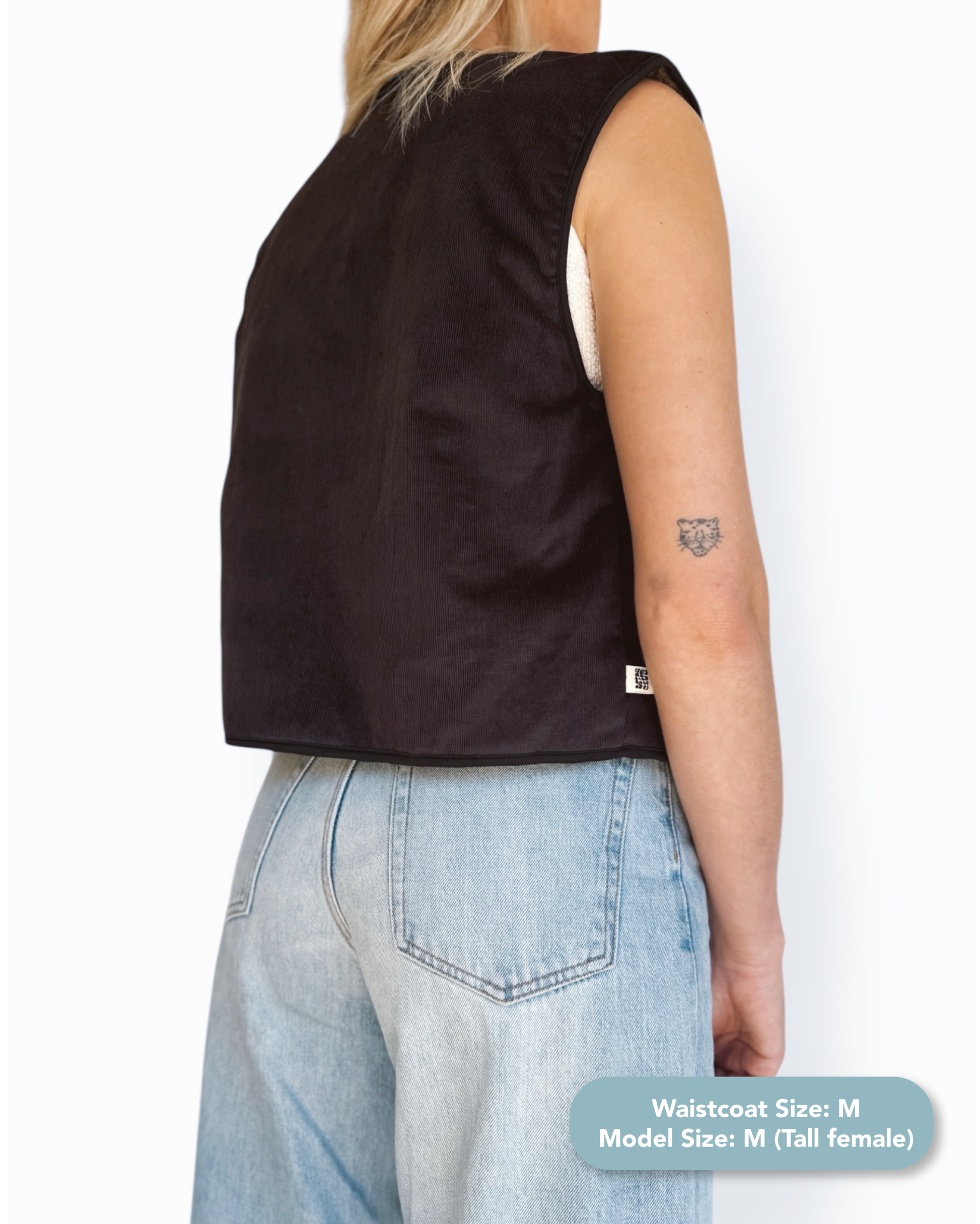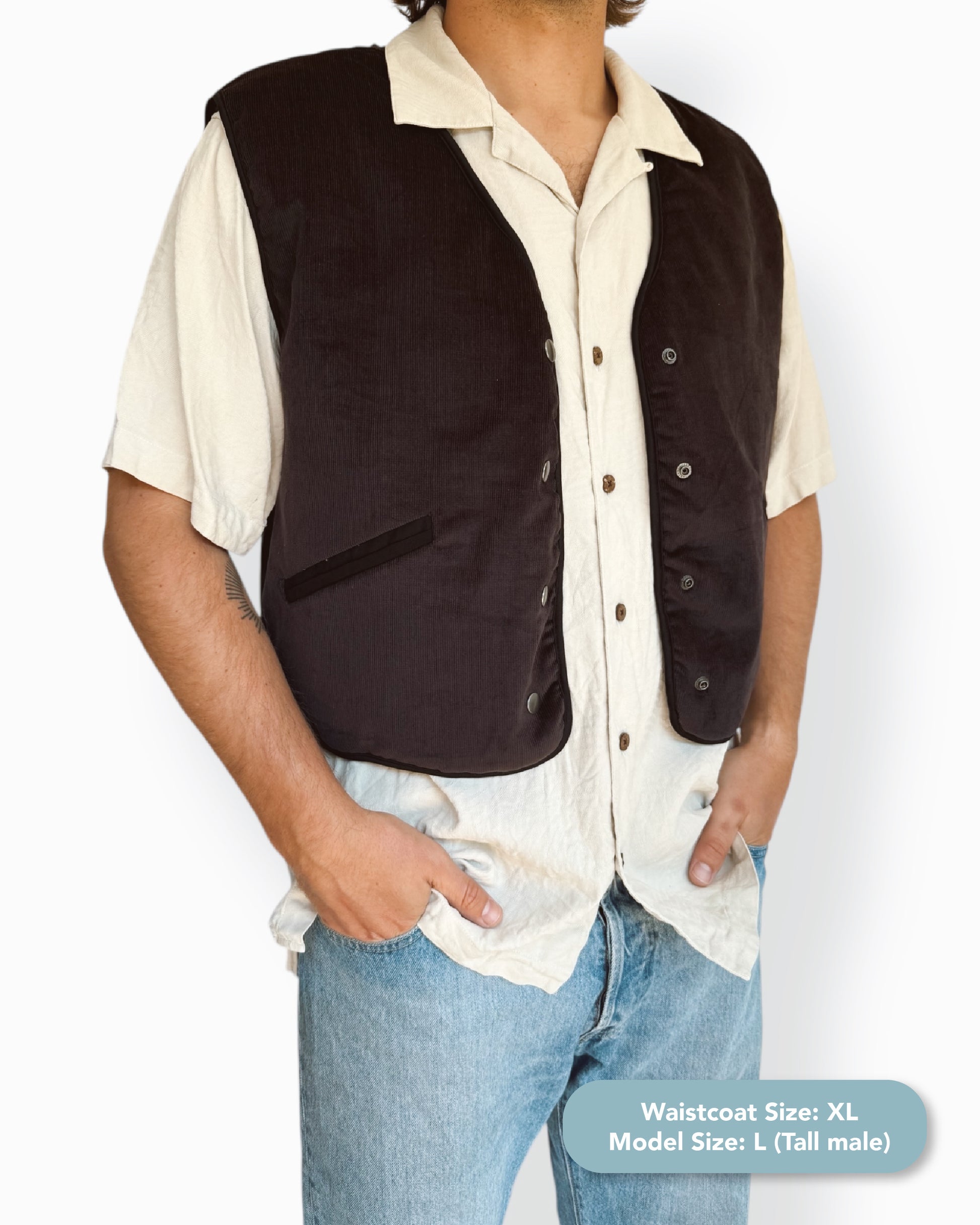 Made from dark brown corduroy with a soft brown polyester sherpa deadstock lining — surplus material from bigger fashion brands that would’ve otherwise gone to waste, now reimagined into something built to last. Finished with gunmetal press studs (also deadstock) and black binding, this unisex gilet is perfect for the cool, laid-back type — lightweight yet warm, versatile, understated with a bit more edge.