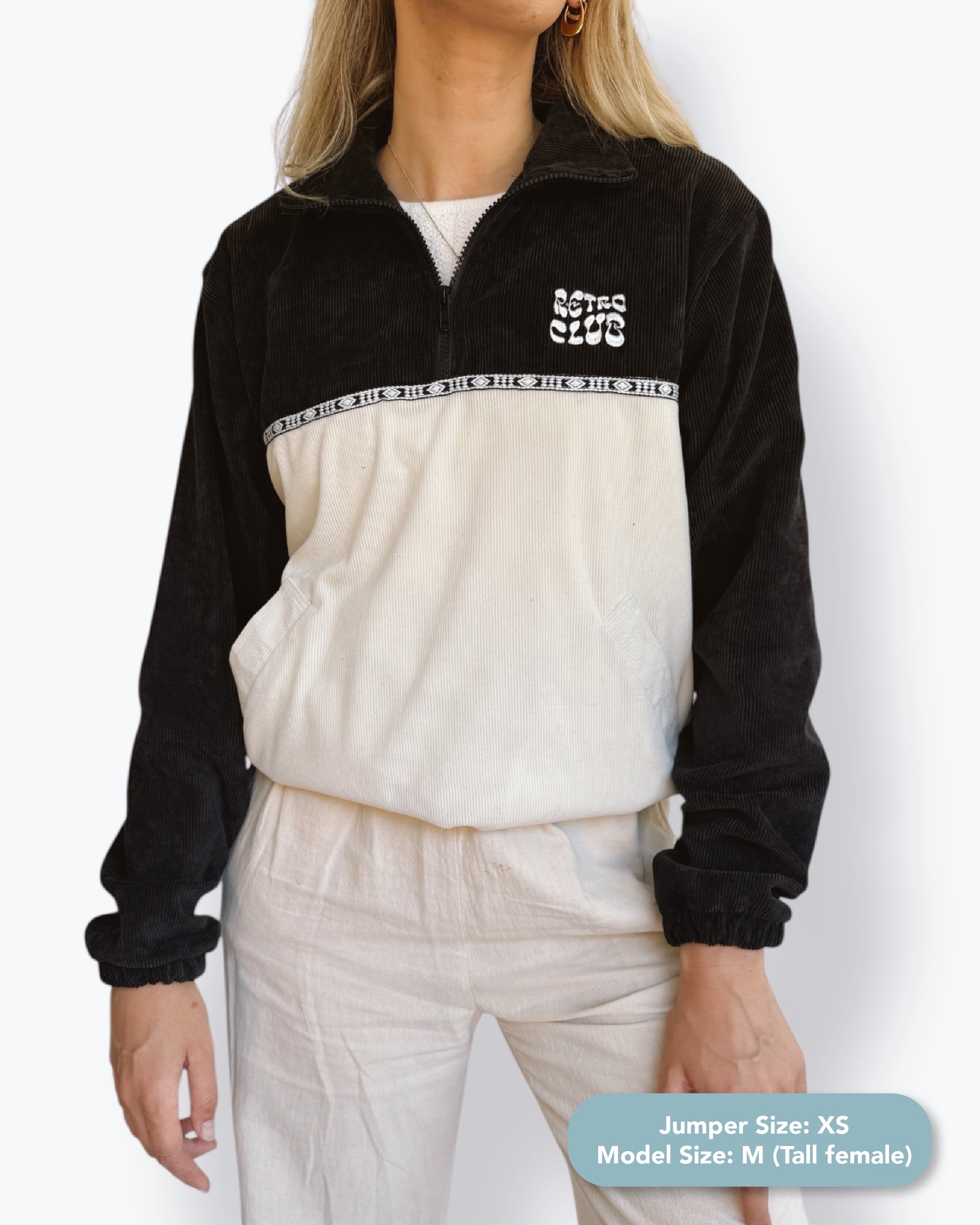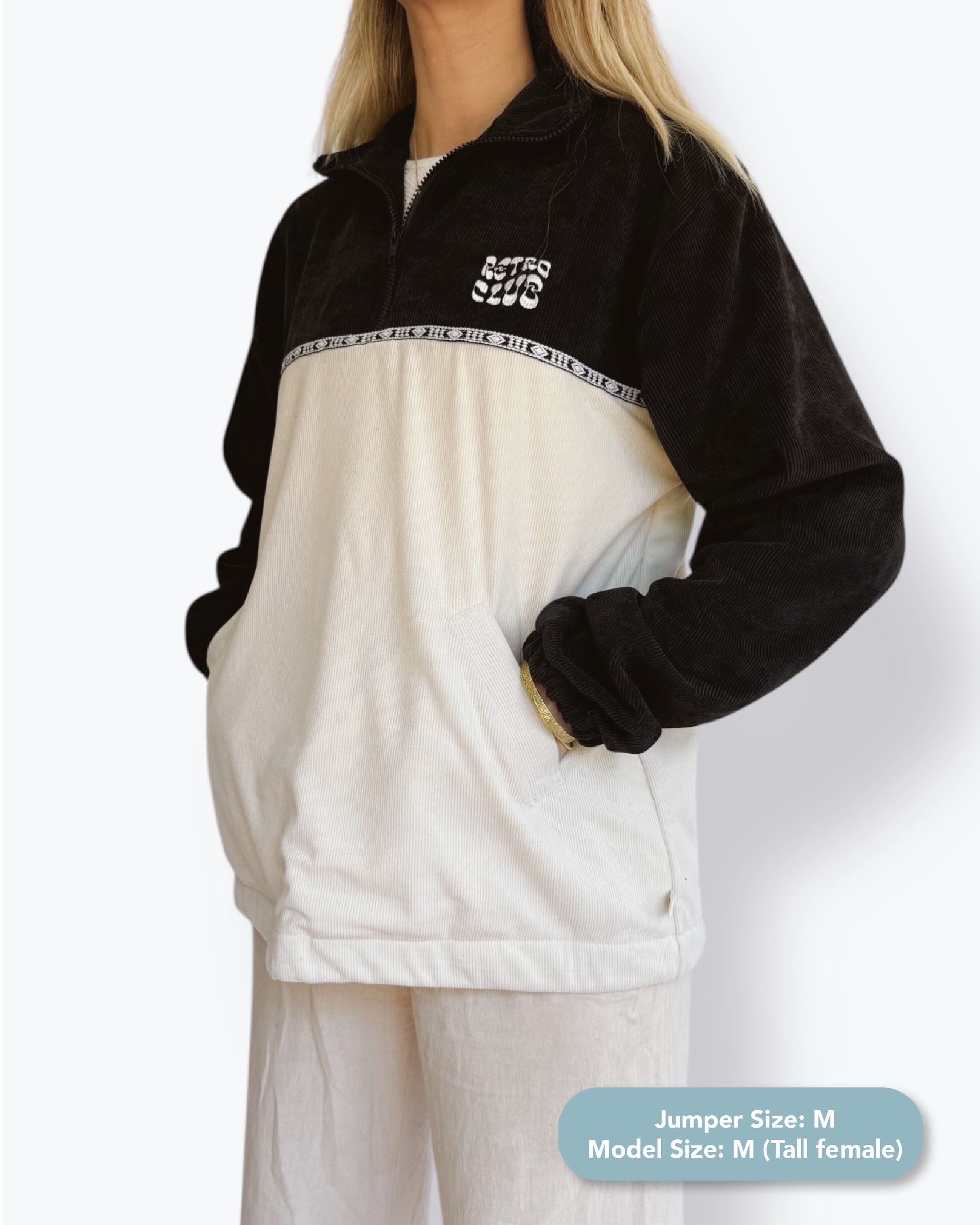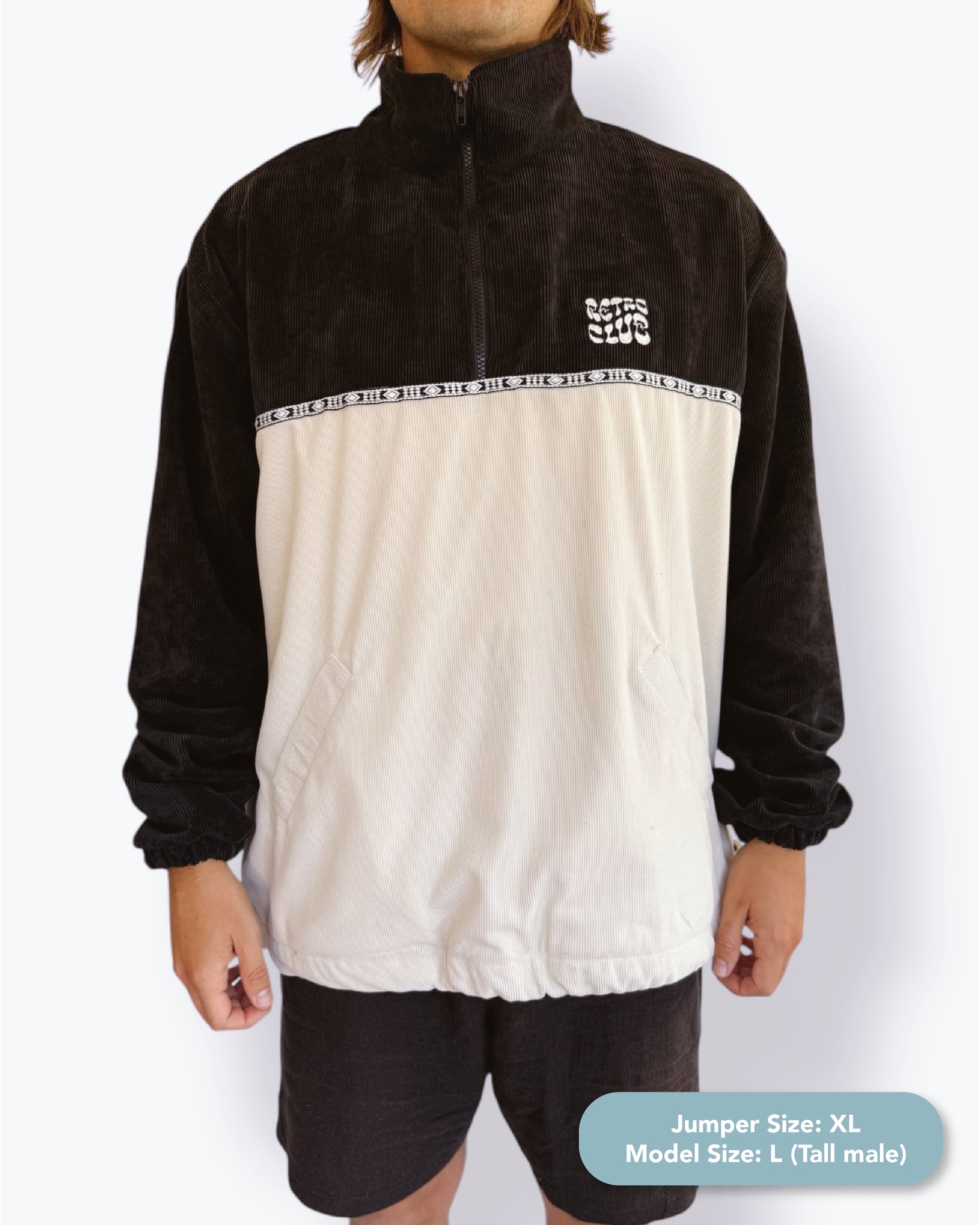 This unisex Dawn Jumper is made from black and cream stretch poly-corduroy — which makes it light weight, non-crease, quick-drying, easy to wear, and perfect for summer layering. It’s lined with soft 100% cotton deadstock tee fabric — surplus material from bigger fashion brands that would’ve otherwise gone to waste, now reimagined into something built to last. Designed with an adjustable toggle for a custom crop fit and pockets for everyday ease. Finished with our signature embroidered wonky logo up front — It's the perfect companion wether you're layering up post-surf, exploring outdoors, or keeping cozy inside.