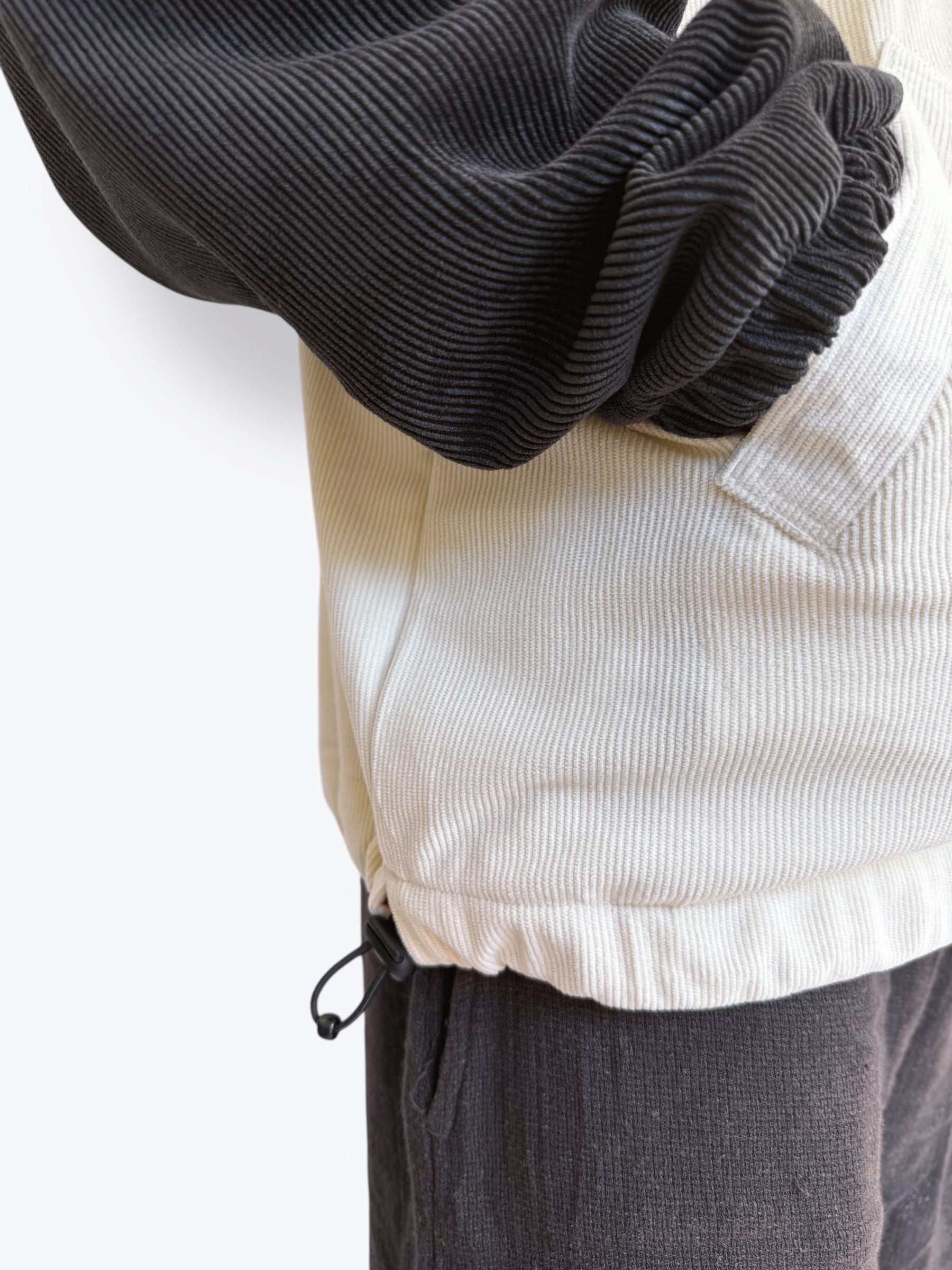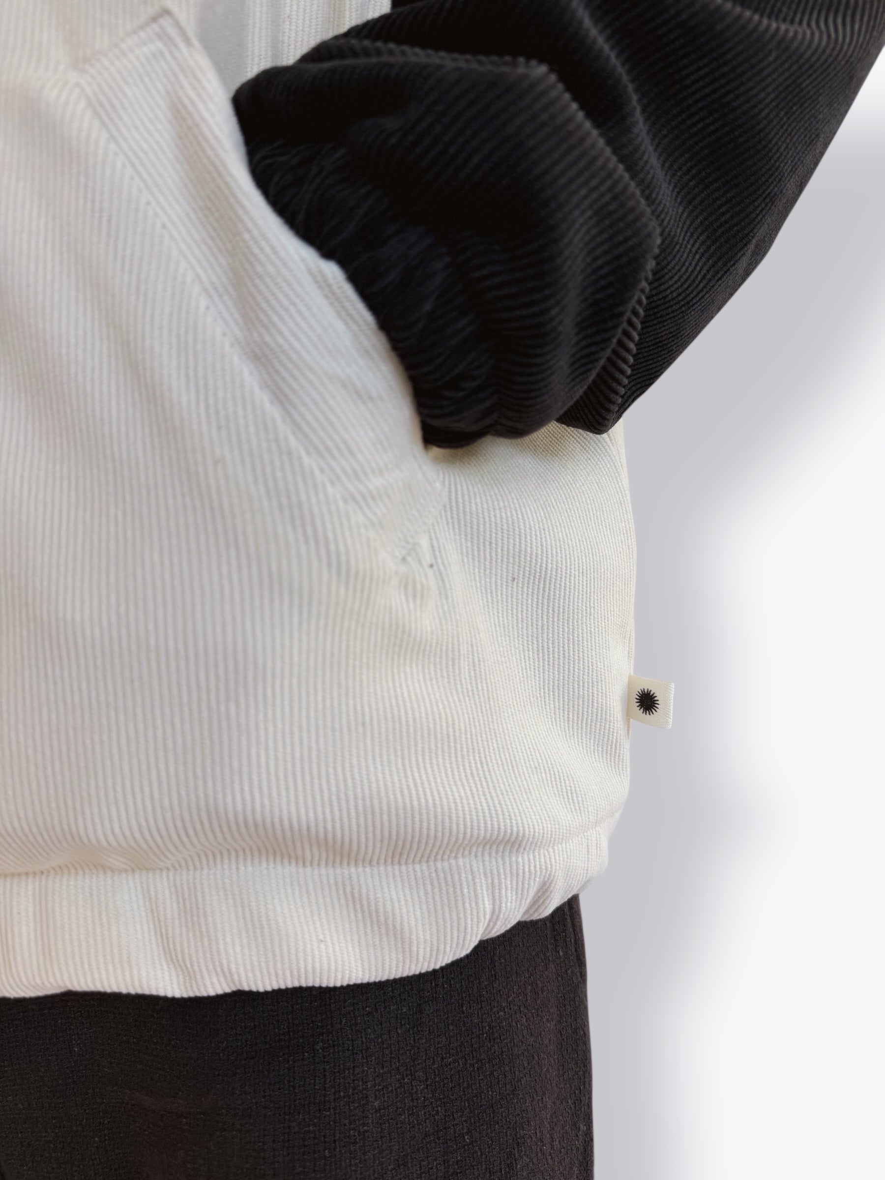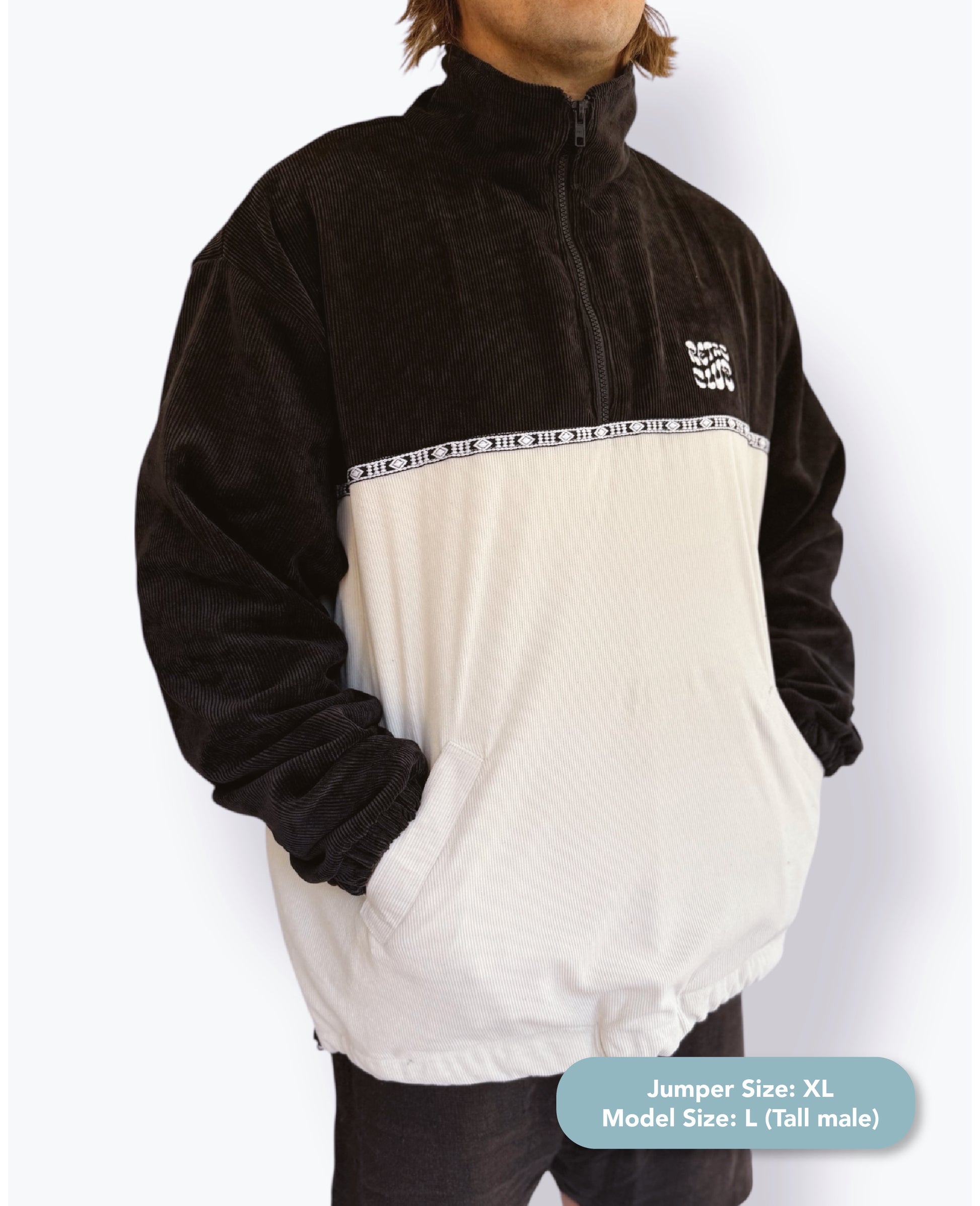 This unisex Dawn Jumper is made from black and cream stretch poly-corduroy — which makes it light weight, non-crease, quick-drying, easy to wear, and perfect for summer layering. It’s lined with soft 100% cotton deadstock tee fabric — surplus material from bigger fashion brands that would’ve otherwise gone to waste, now reimagined into something built to last. Designed with an adjustable toggle for a custom crop fit and pockets for everyday ease. Finished with our signature embroidered wonky logo up front — It's the perfect companion wether you're layering up post-surf, exploring outdoors, or keeping cozy inside.