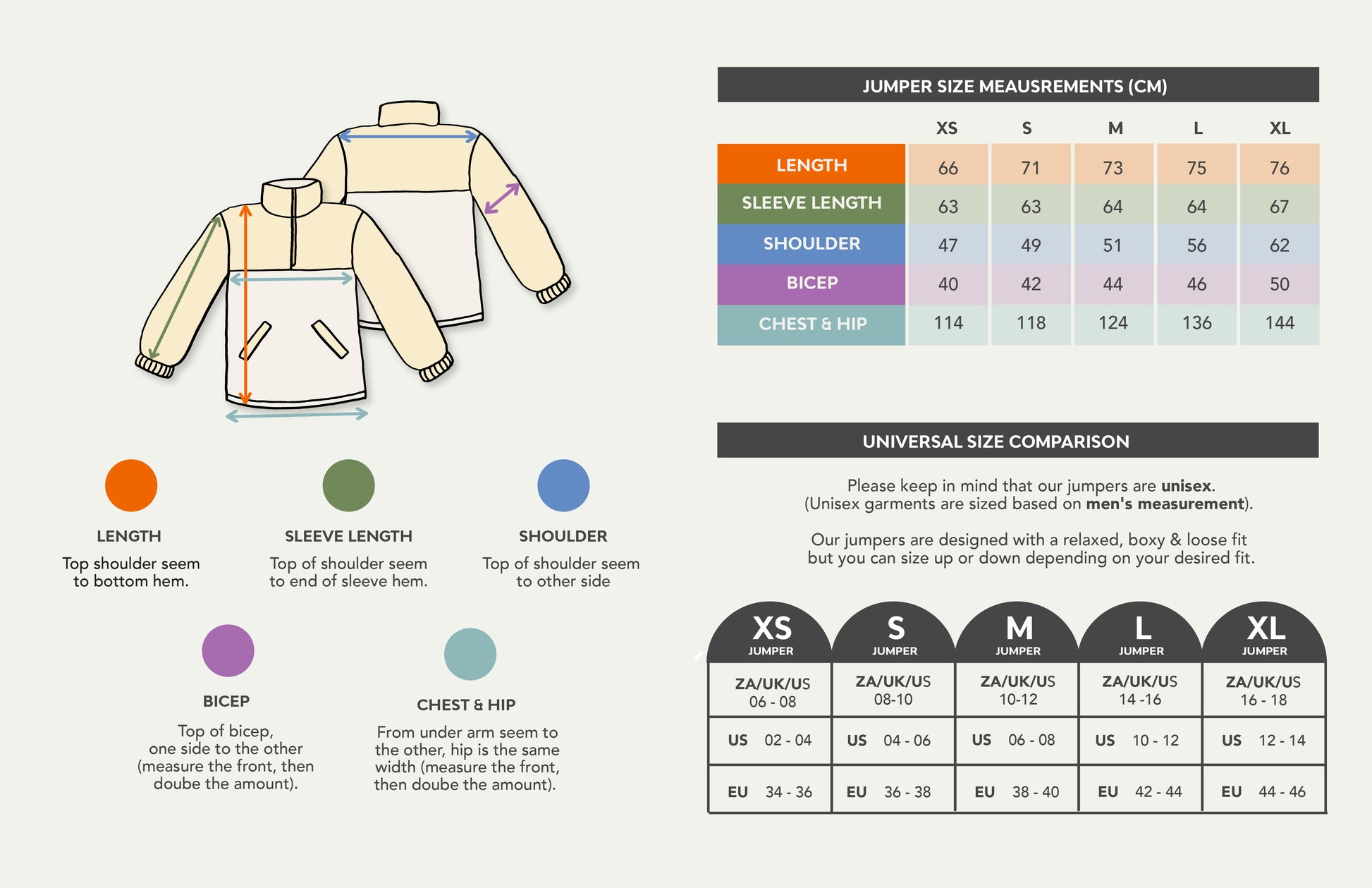 When choosing your size, refer to the size guide (last image) or feel free to reach out to us if you need help. Keep in mind that our jumpers are unisex - unisex garments are based on men's sizing, so it is recommended to size down if you have a female body type. Our jumpers are also designed with a relaxed, boxy & loose fit but you can size up or down depending on your desired fit.