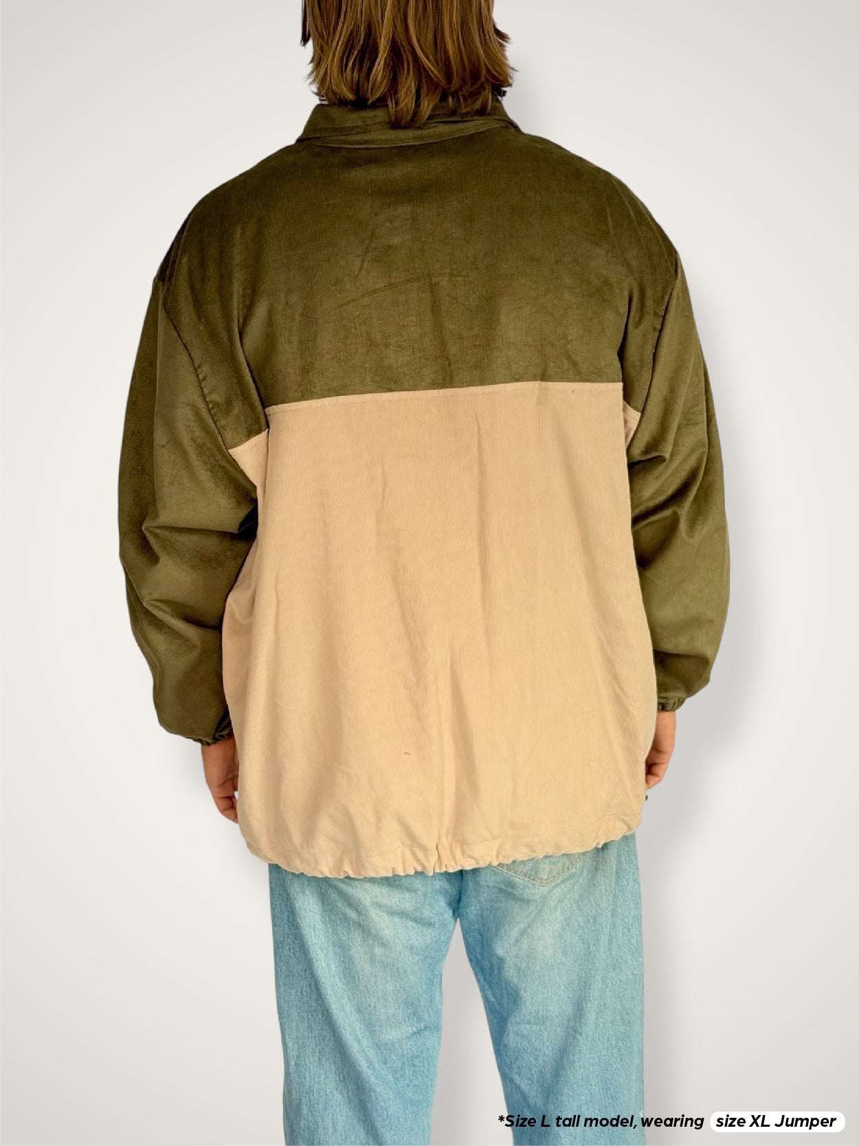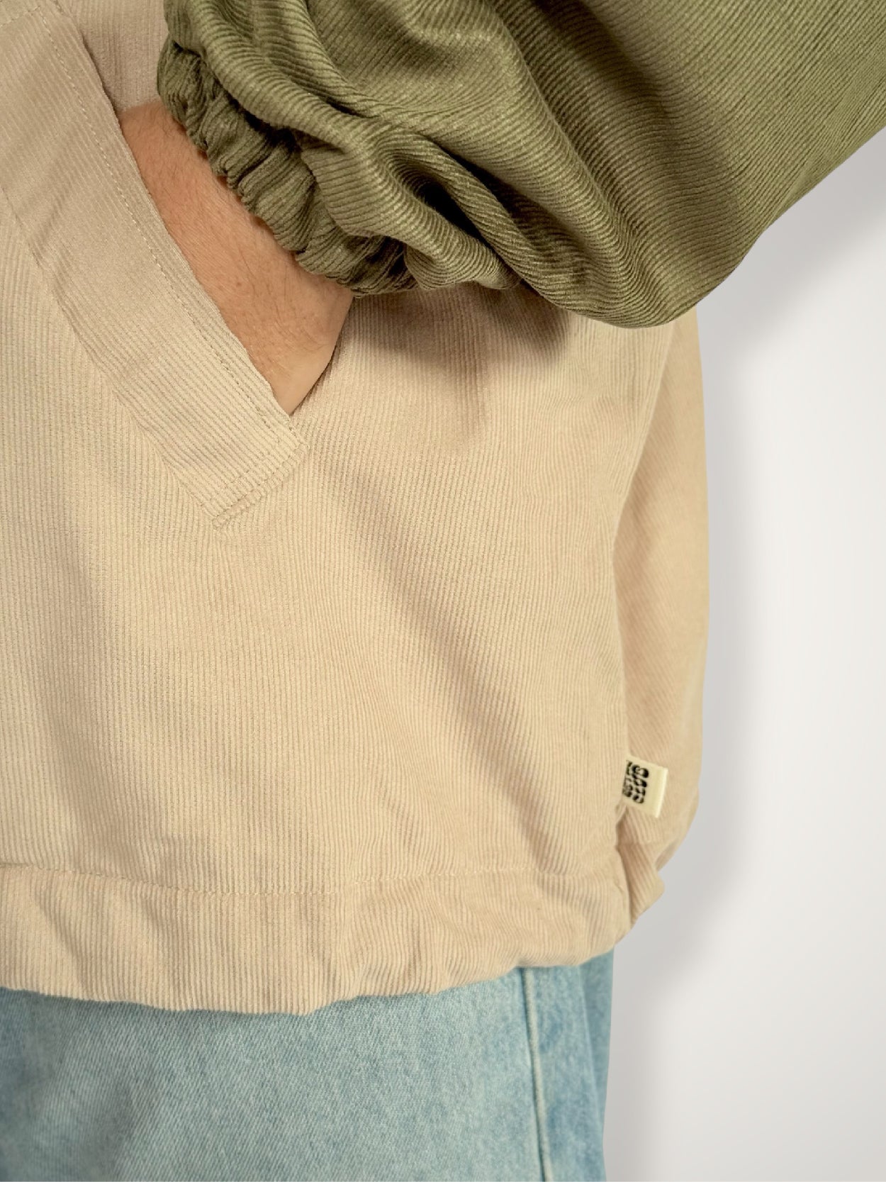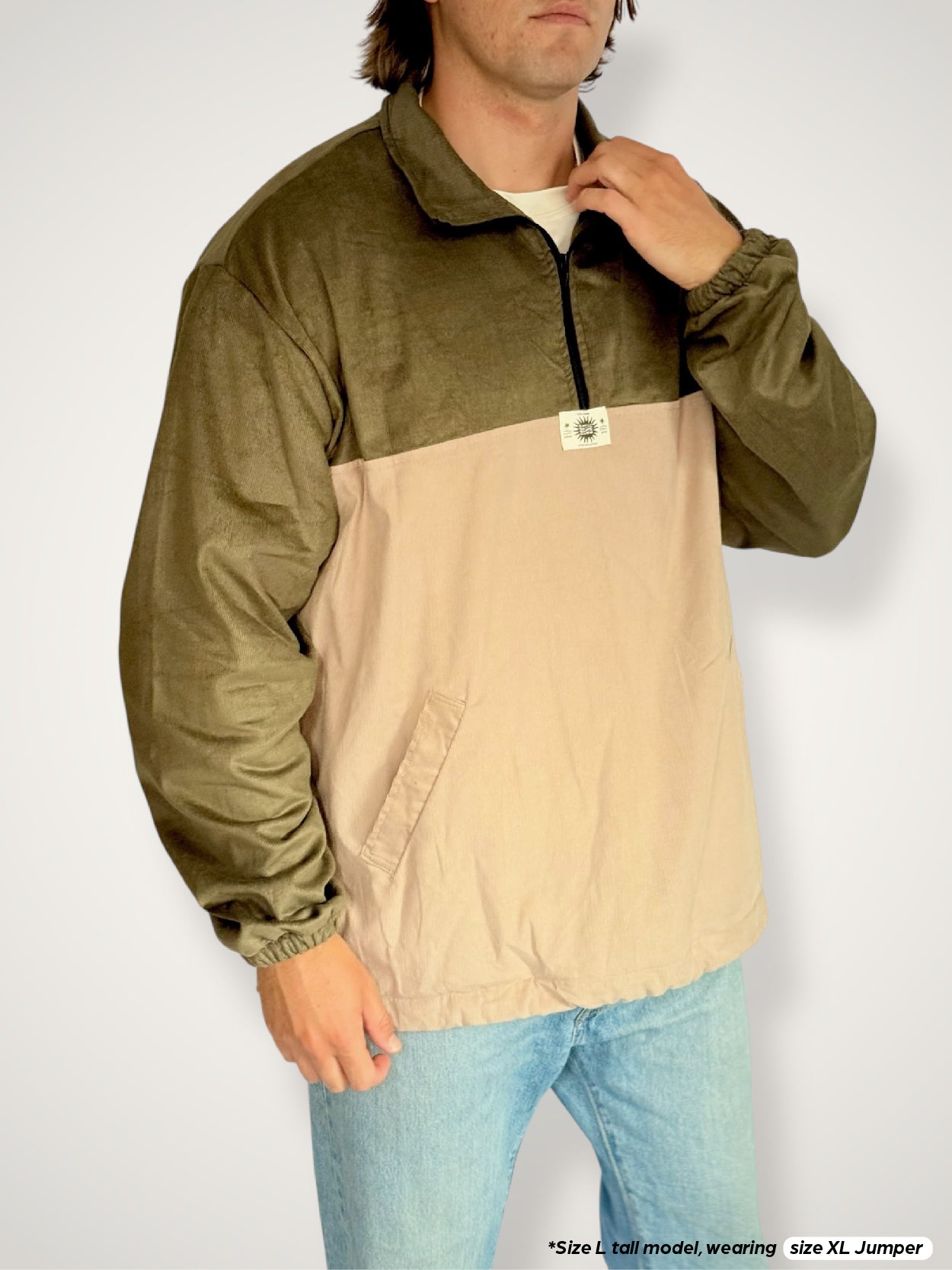 Heavy weight corduroy quarter-zip jumper in an olive & beige two tone, featuring our brand label centre chest. Soft 100% cotton tee lining for extra comfort. Quarterzip neckline, two front pockets and an adjustable toggle & string hem.