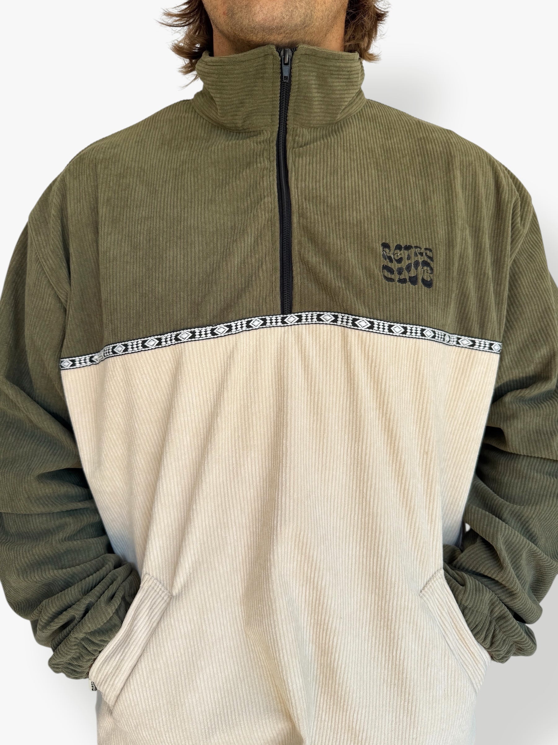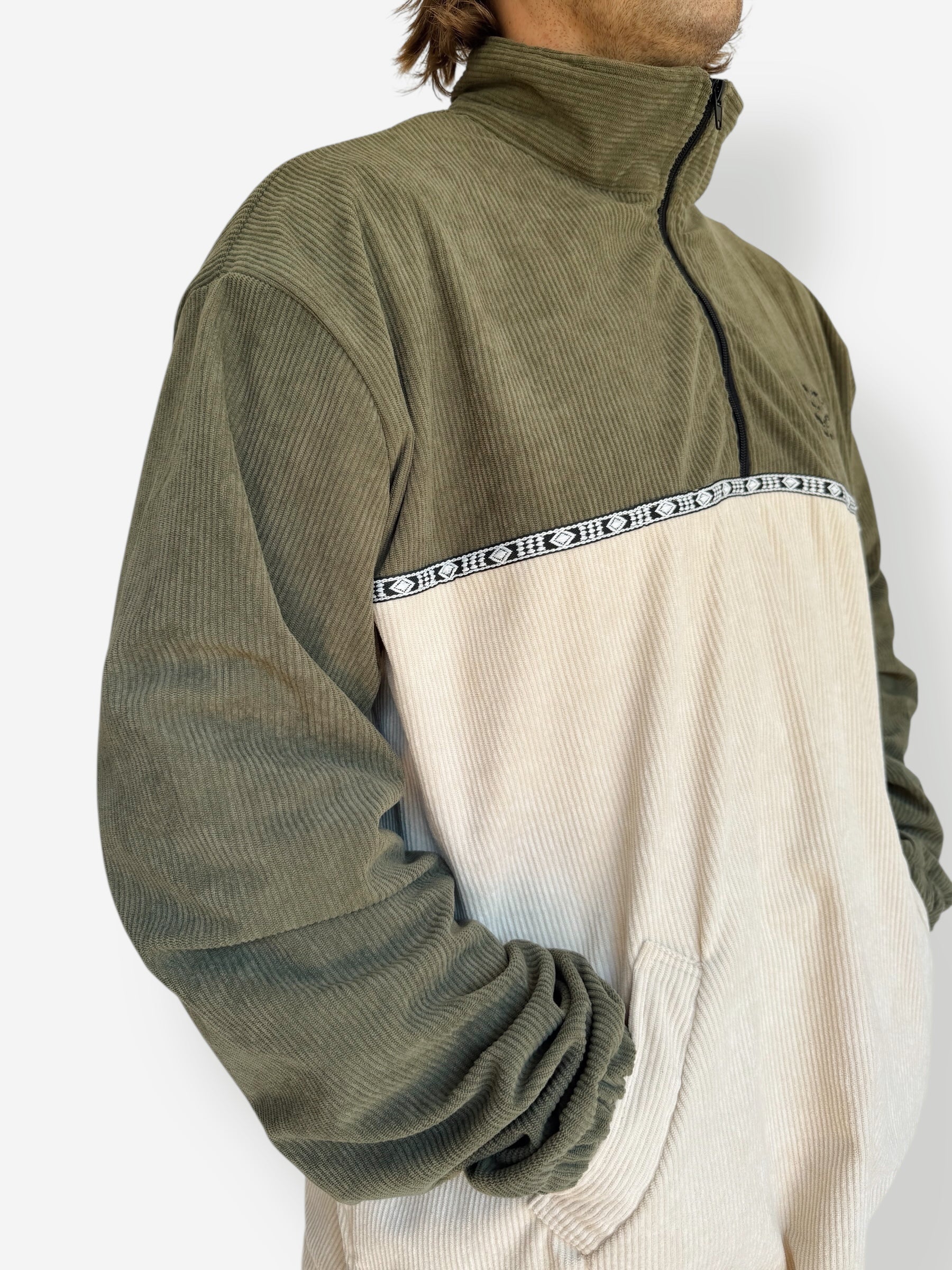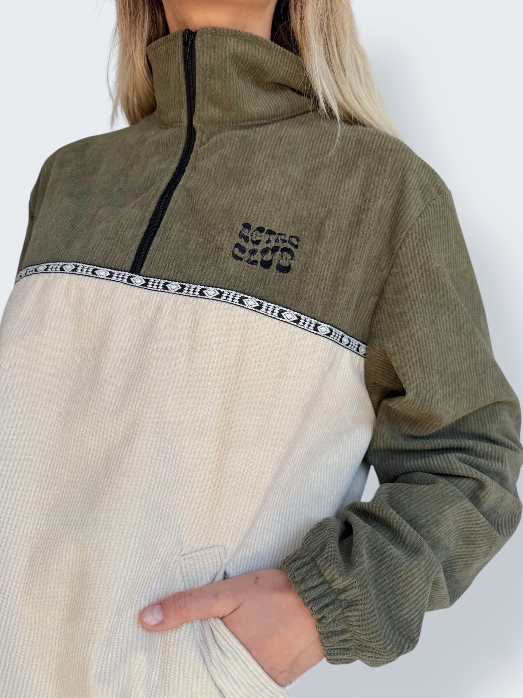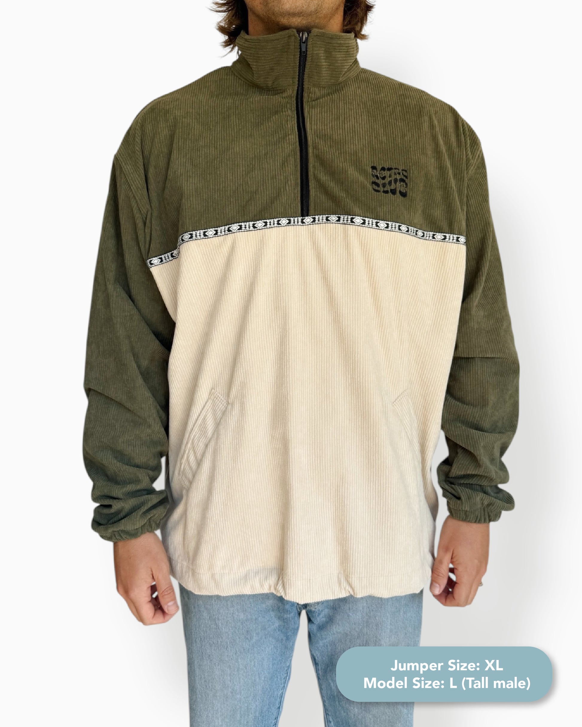 This unisex Dawn Jumper is made from olive and cream stretch poly-corduroy — which makes it light weight, quick-drying, easy to wear, and perfect for summer layering. It’s lined with soft 100% cotton deadstock tee fabric — surplus material from bigger fashion brands that would’ve otherwise gone to waste, now reimagined into something built to last. Designed with an adjustable toggle for a custom crop fit and pockets for everyday ease. Finished with our signature embroidered wonky logo up front — It's the perfect companion wether you're layering up post-surf, exploring outdoors, or keeping cozy inside.