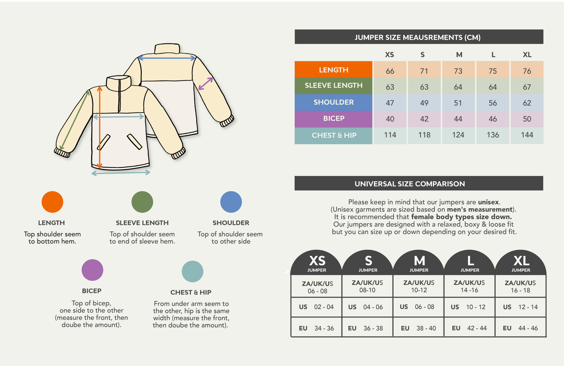 When choosing your size, refer to the size guide (last image) or feel free to reach out to us if you need help. Keep in mind that our jumpers are unisex - unisex garments are based on men's sizing. Our jumpers are also designed with a relaxed, boxy & loose fit but you can size up or down depending on your desired fit.
