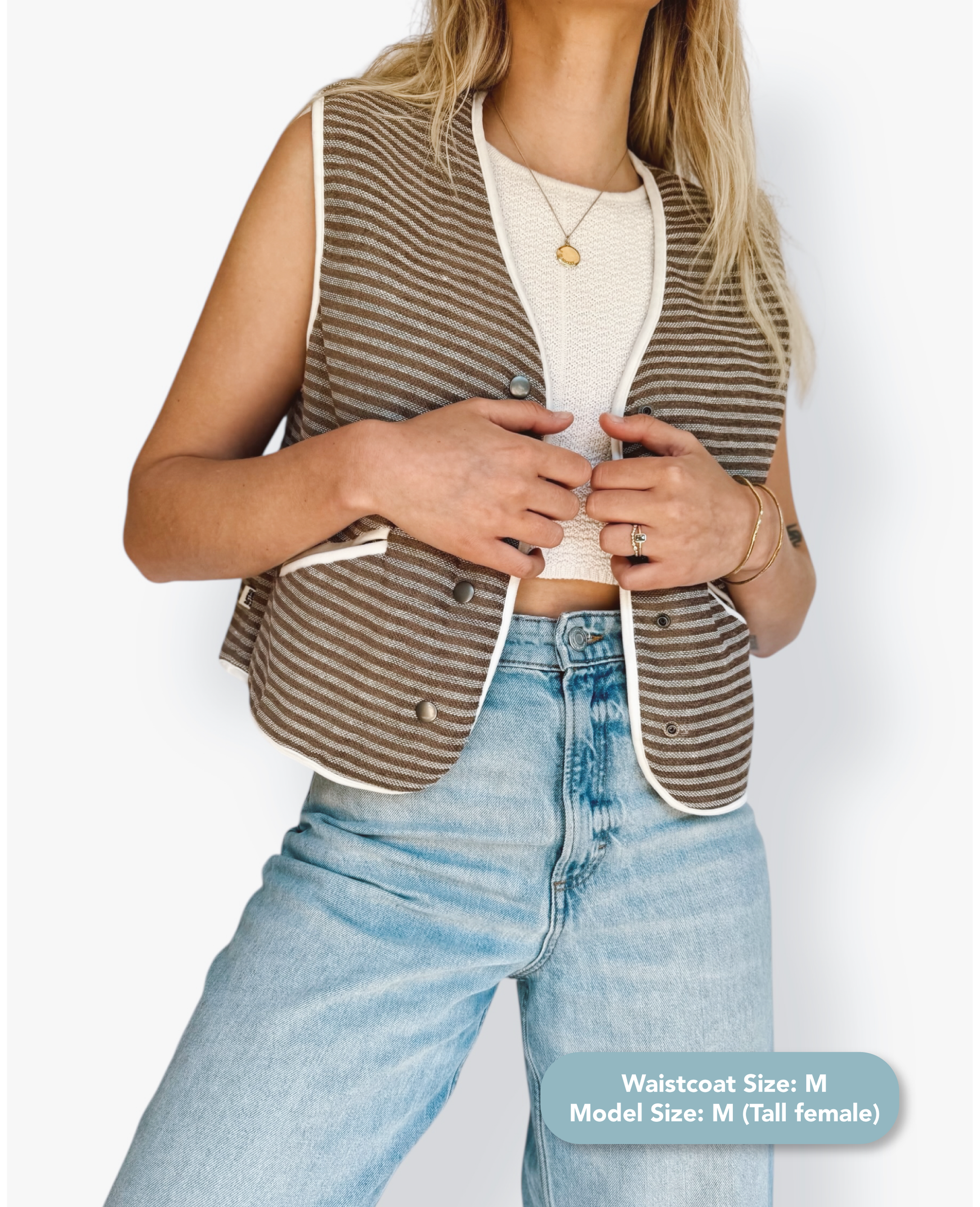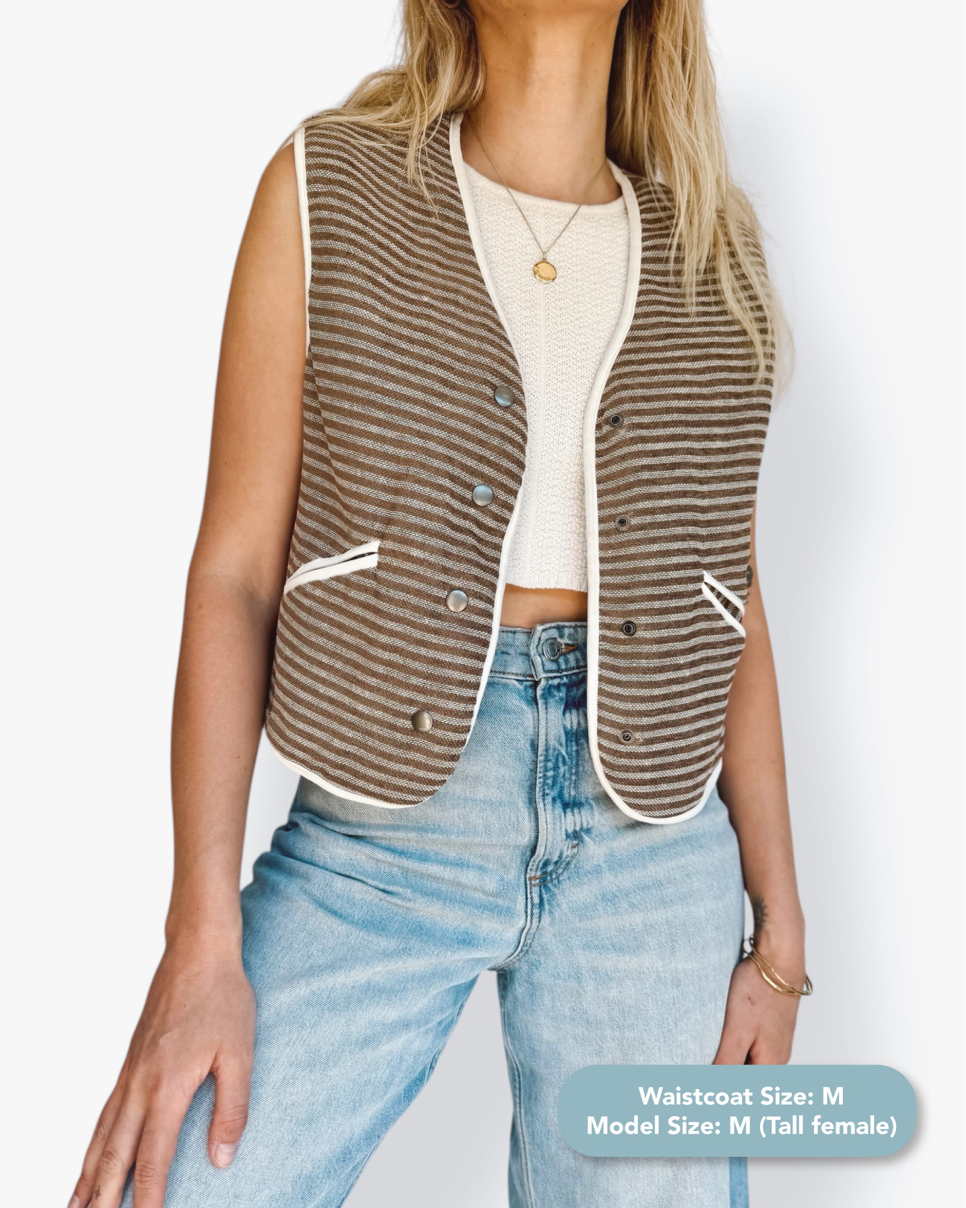 Your go-to spring layer. Made from striped end-roll upholstery fabric with a soft brown polyester sherpa deadstock lining — surplus material from bigger fashion brands that would’ve otherwise gone to waste, now reimagined into something built to last. Finished with gunmetal press studs (also deadstock) and crisp white binding, this unisex gilet is the perfect spring layering piece — lightweight yet warm, versatile, and full of character.