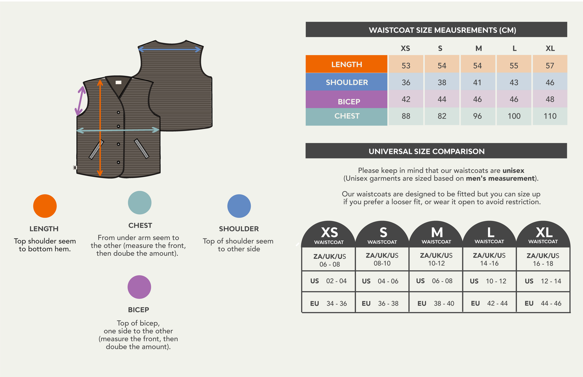 When choosing your size, refer to the size guide (last image) or feel free to reach out to us if you need help. Please keep in mind that our waistcoats are unisex (unisex garments are based ons mens measurements). Our waistcoats are designed to be fitted but you can size up if you prefer a looser fit, or wear it open to avoid restriction.